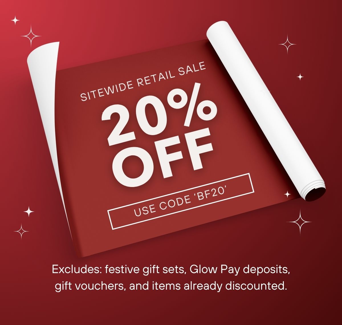 Excludes: festive gift sets (they already have HUGE savings), Glow Pay deposits, gift vouchers, and items already discounted.